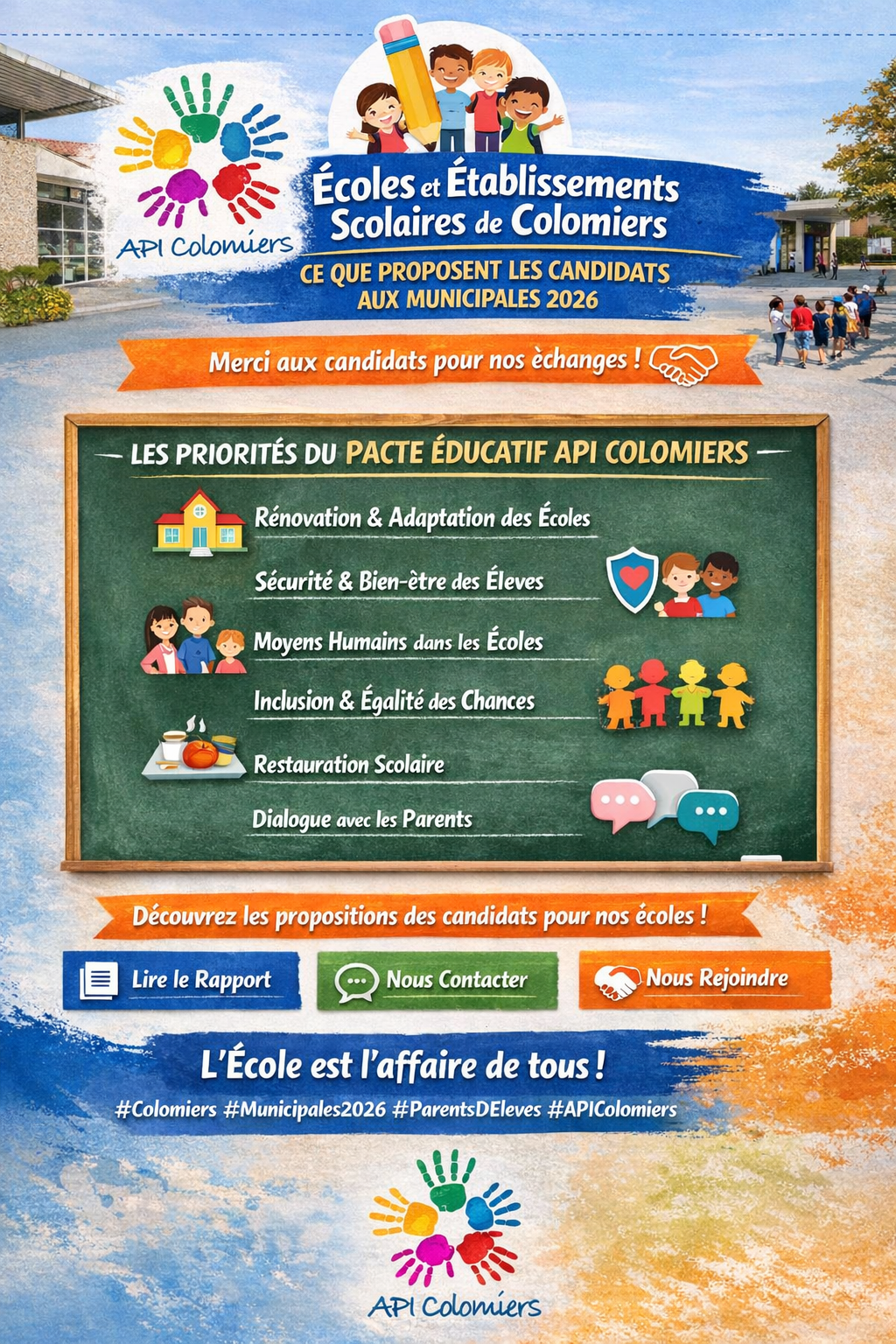 À l’approche des élections municipales, notre association de parents d’élèves a rencontré plusieurs listes candidates afin d’échanger sur un sujet essentiel : l’avenir des écoles, établissements scolaires et du périscolaire à Colomiers.