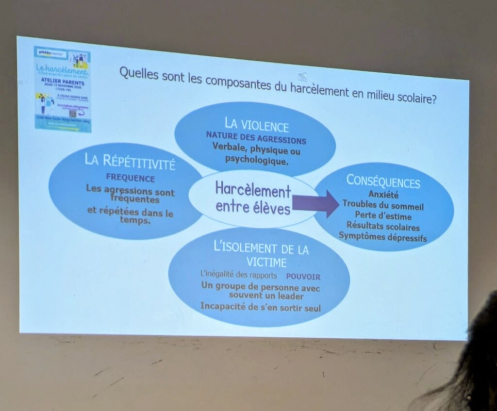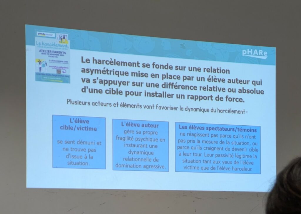 Jeudi dernier s’est tenue une réunion d’information sur le harcèlement, organisée par les écoles élémentaires Hélène Boucher, Alain Savary et George Sand. L’occasion pour la vingtaine de personnes présentes d’en savoir plus sur ce qu’est le harcèlement et sur les actions menées.