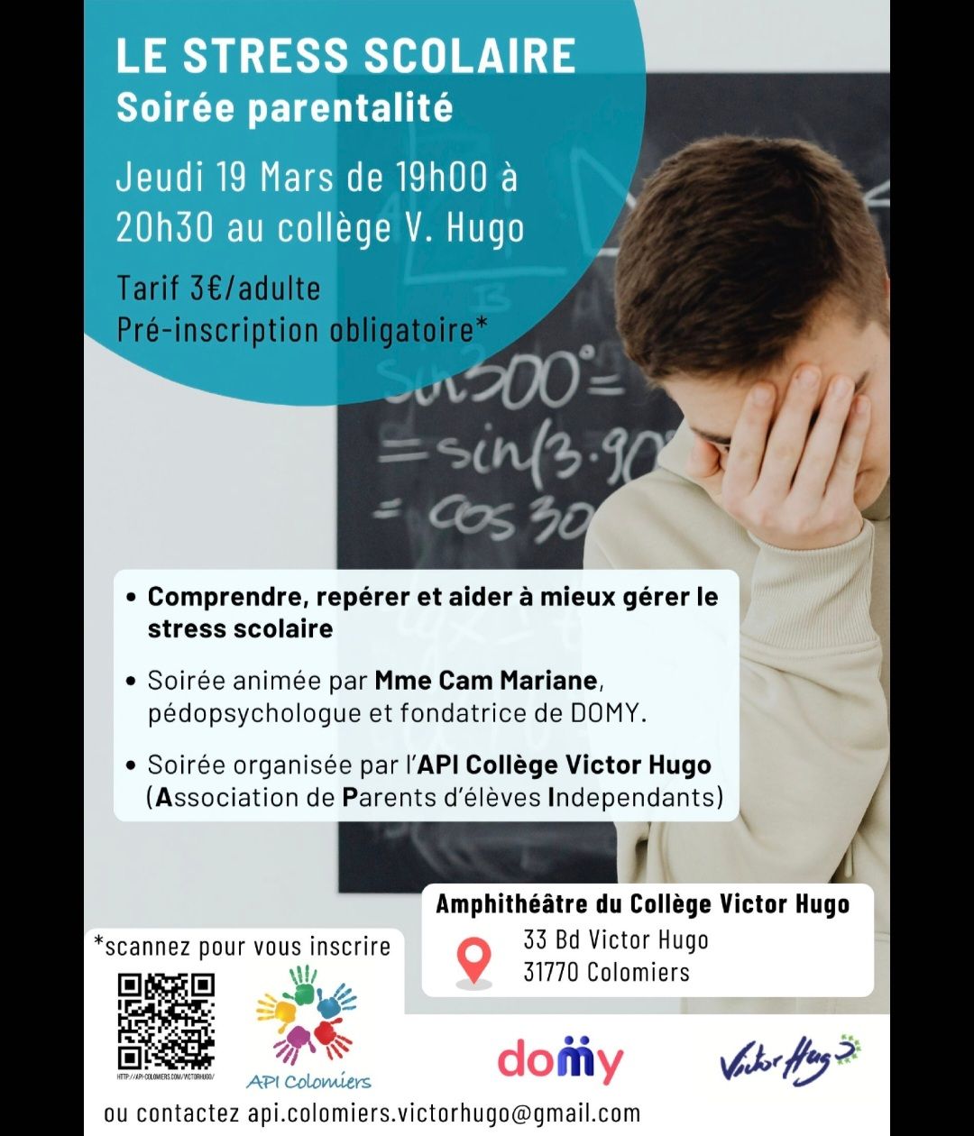 L’Ă©quipe API du Collège Victor Hugo vous invite Ă  une soirĂ©e parentalitĂ© sur le stress et la phobie scolaire.