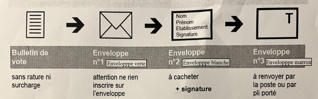 Vous pouvez voter par correspondant (vote par pli porté) jusqu’au 10 octobre 2025 (limite horaire à vérifier dans le mot du cahier suivant la maternelle ou l’élementaire).