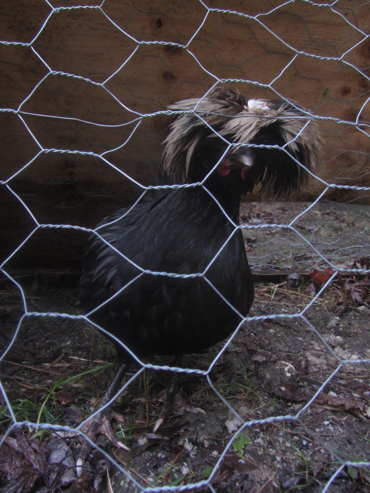 Personne ne sait à quelle race elle appartient. Moi je dirai une cousine de la famille « Houdan noire cailloutée de blanc »… Si vous avez une idée… écrivez-nous !