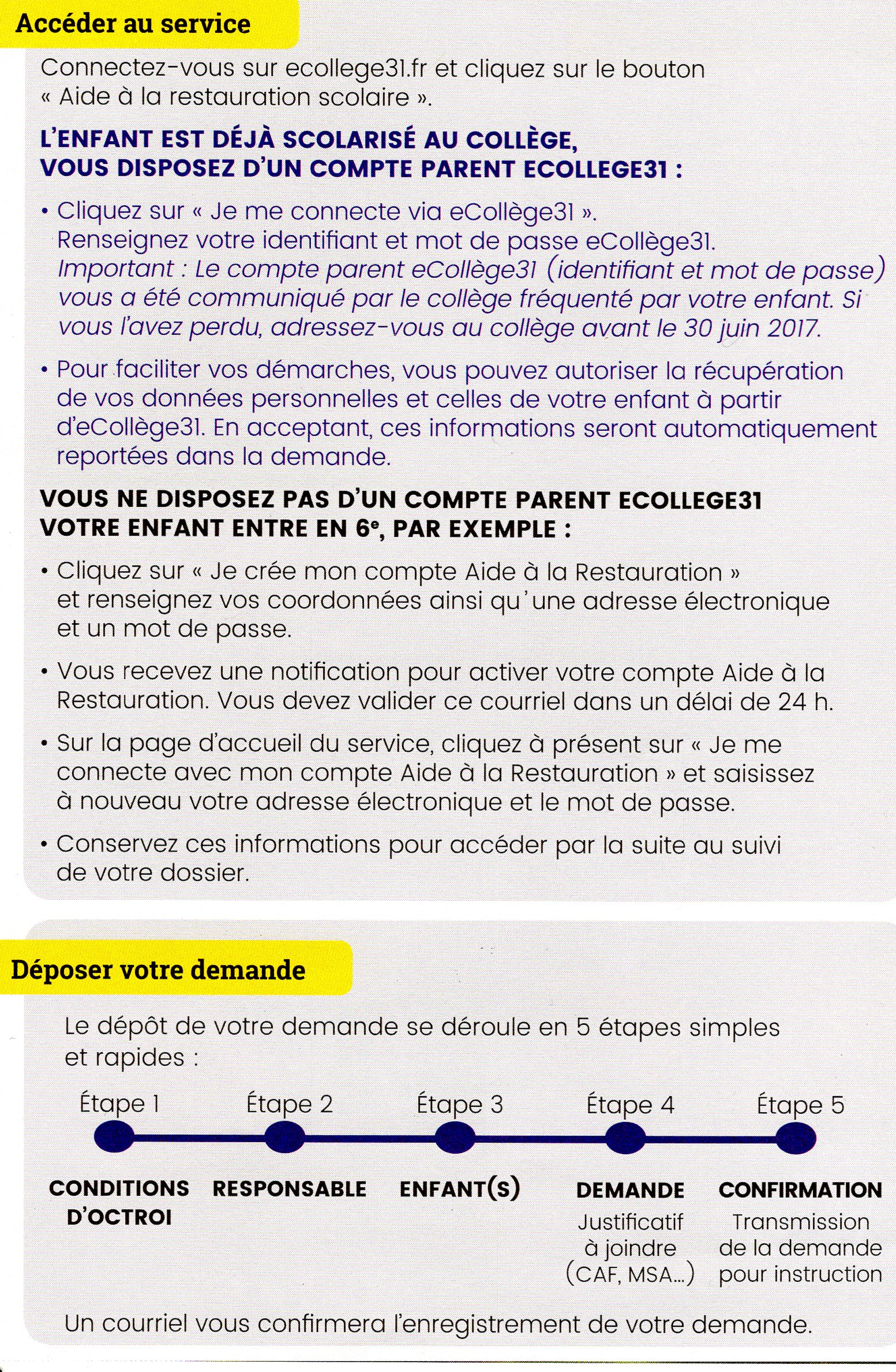 - avoir un enfant demi-pensionnaire (4 repas par semaine minimum, sauf aménagement du temps scolaire pour raison de santé) scolarisé de la 6e à la 3e dans un collège public ou privé sous contrat d’association avec l’Etat dans le département de la Haute-Garonne