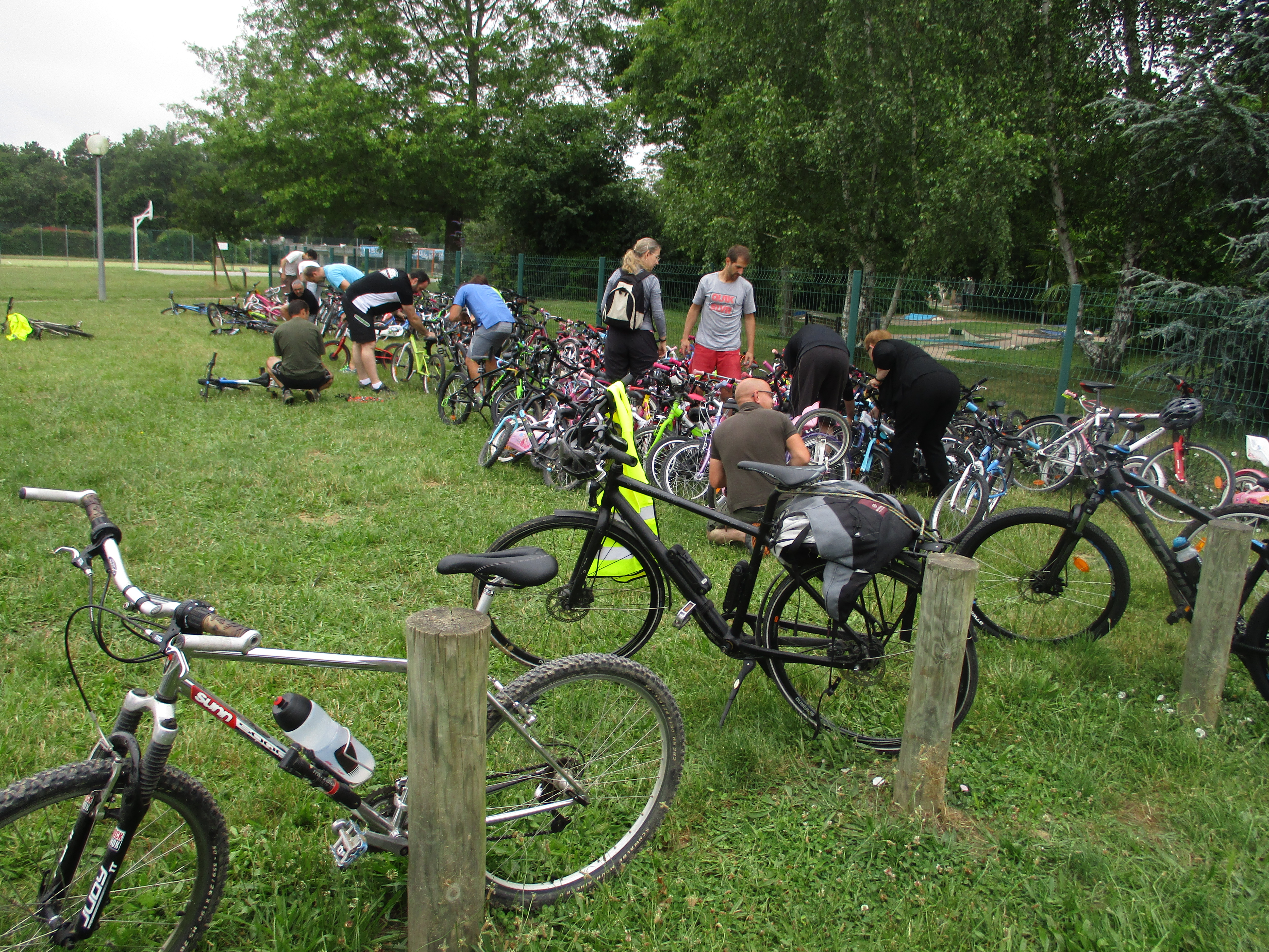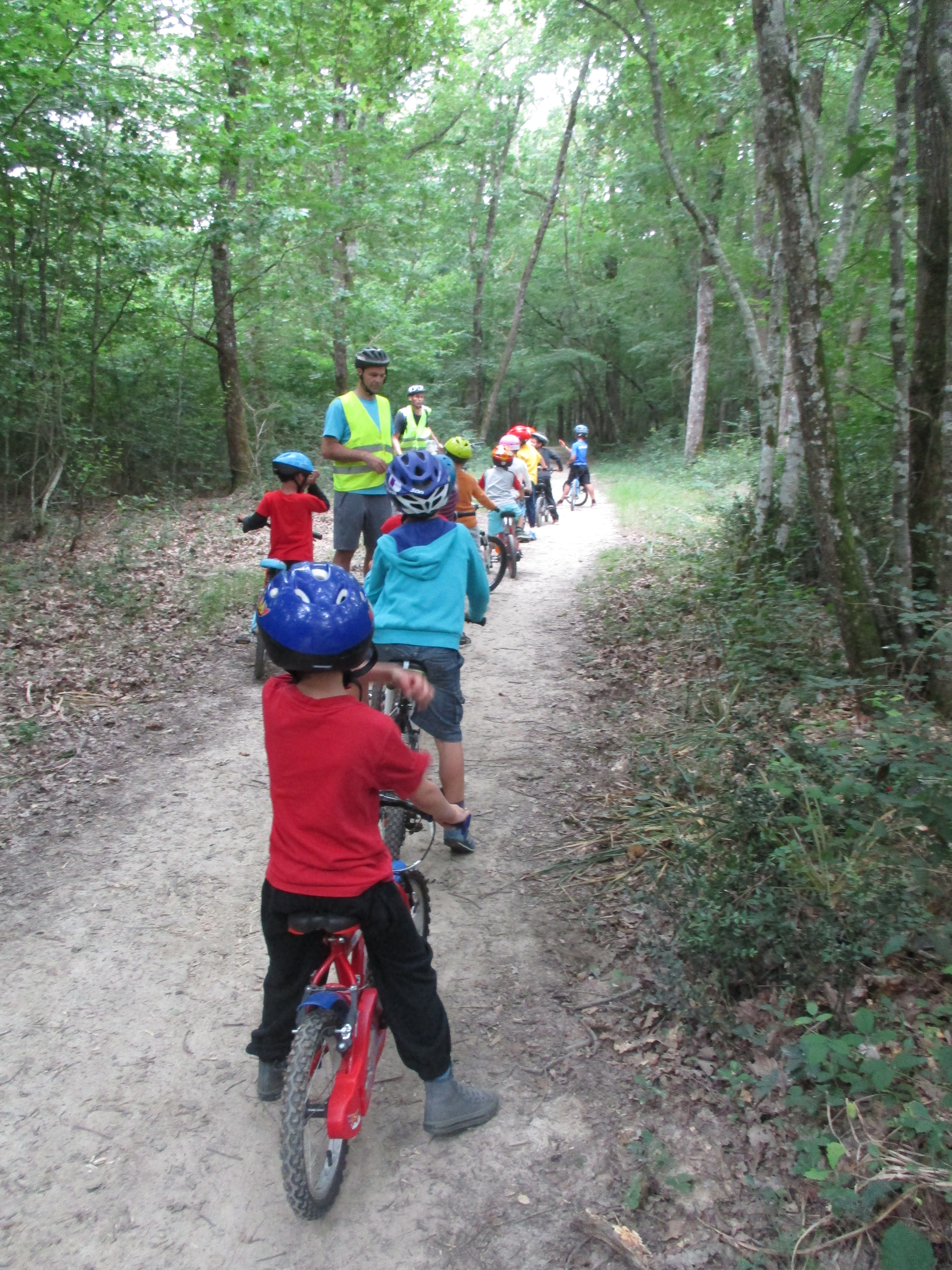 IMG_1396Vendredi 24 juin : 160 vélos chargés dans les camionnettes et monospaces dès 7h45 par une fourmilière de parents, dont de nombreux papas. Les équipes constituées par les maîtresses, les feuilles de route de la journée distribuées sur place par le conseiller pédagogique en charge du sport, et voilà nos enfants dispersés la forêt selon plusieurs itinéraires, s’entraînant à rouler doucement, à freiner brusquement (1,23 soleil), à grimper des pentes (dont « la montée de la mort « !), à réaliser des slaloms…