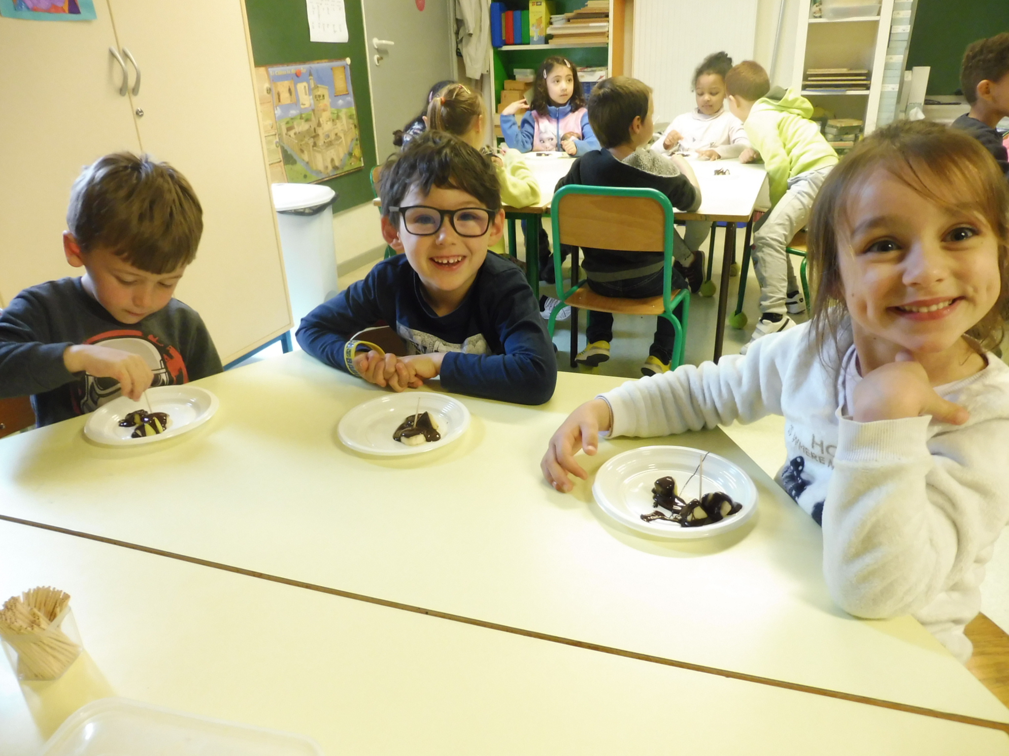 P1060081Lundi après-midi, les élèves de grande section ont découvert les secrets de fabrication du chocolat, avant de goûter une mini-fondue aux fruits et son coulis délicieux…
