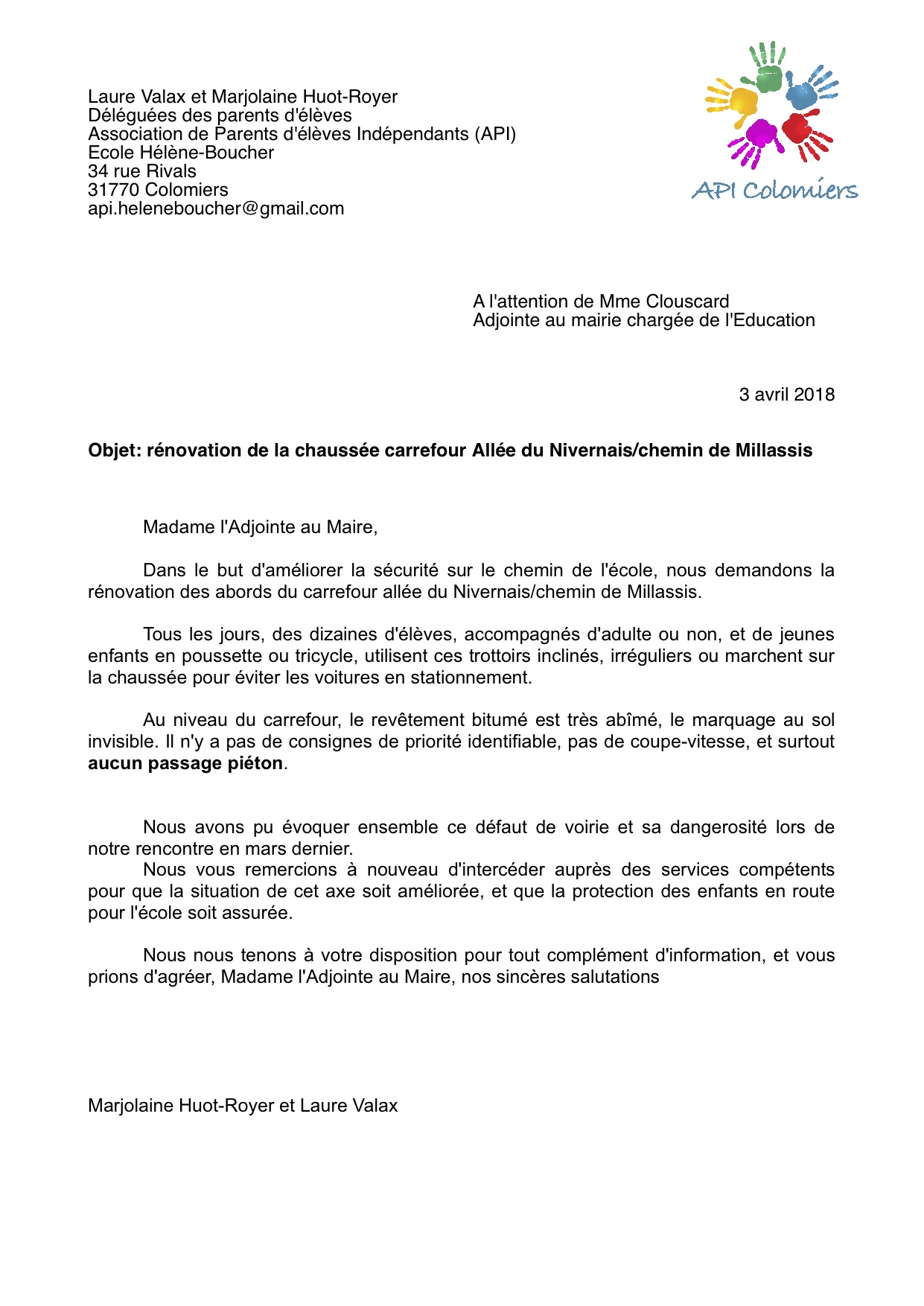 P1050737Nous avons transmis à la municipalité, sur les conseils de Mme Clouscard-Martinato (adjointe au maire en charge des affaires scolaires), un courrier demandant la rénovation de la chaussée et du croisement chemin de Millassis/allée du Nivernais.