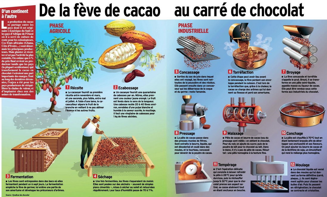 De la cabosse à la tablette du goûter, il y a beaucoup d’étapes… et de kilomètres ! Cueillette dans les plantations des pays tropicaux, séchage des fèves, tri, torréfaction, séparation du beurre et du cacao, ajout de sucre pour atténuer l’amertume, réduction à température idéale pour le façonner…
