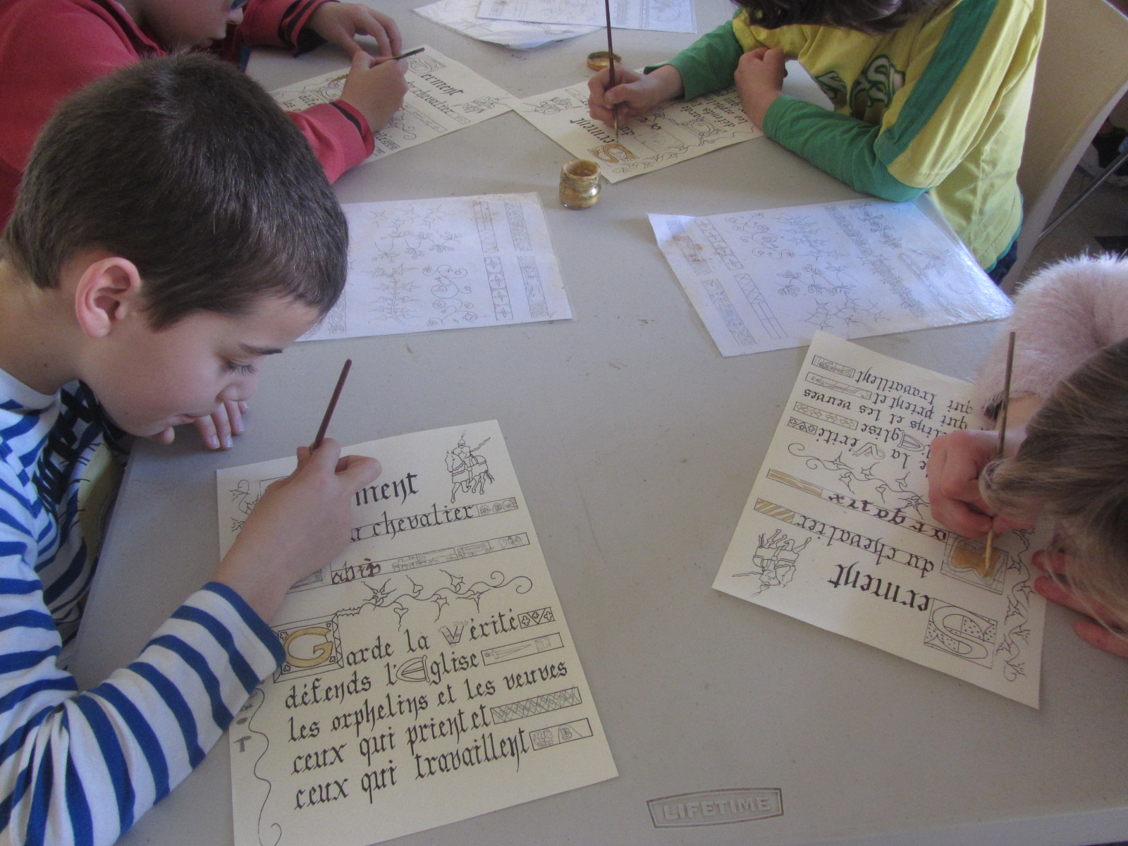 Enseignement, alimentation, toilette et vie familiale sont décrits au fil des étages du beffroi. Dans la salle, les élèves découvrent la calligraphie puis l’ornement des lettrines, en personnalisant un serment du chevalier. Un parcours autour du petit village a permis à chacun de s’initier au tir à l’arc, de s’imaginer cloué au pilori, de chercher le blason local… Une belle journée hors du temps !